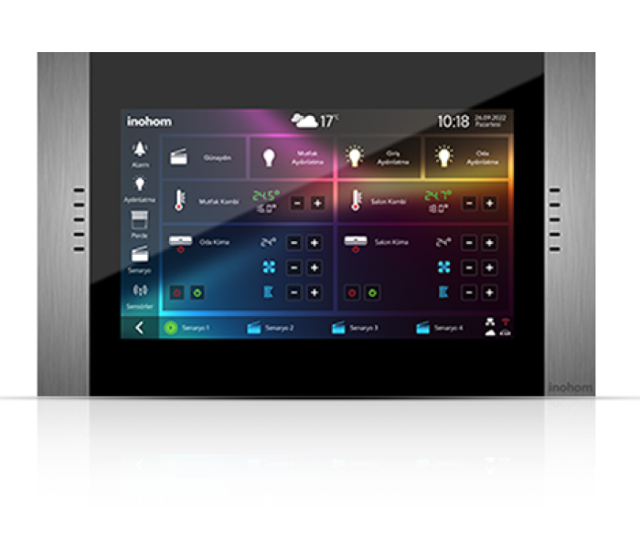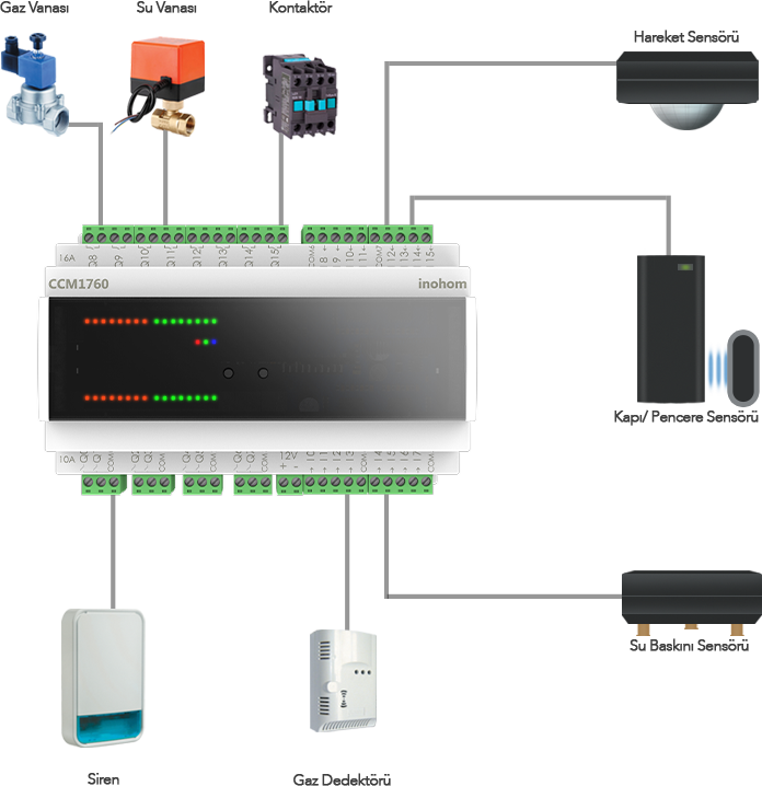 Dijital girişlerine bağlanan kablolu sensörler veya inohom kablosuz ürün grubu ile haberleşerek, çıkışlarına bağlanan doğal gaz vanası, su vanası, ana enerji kontaktörü ve siren gibi kontrollere hükmederek güvenliğiniz kontrol altına alınır.